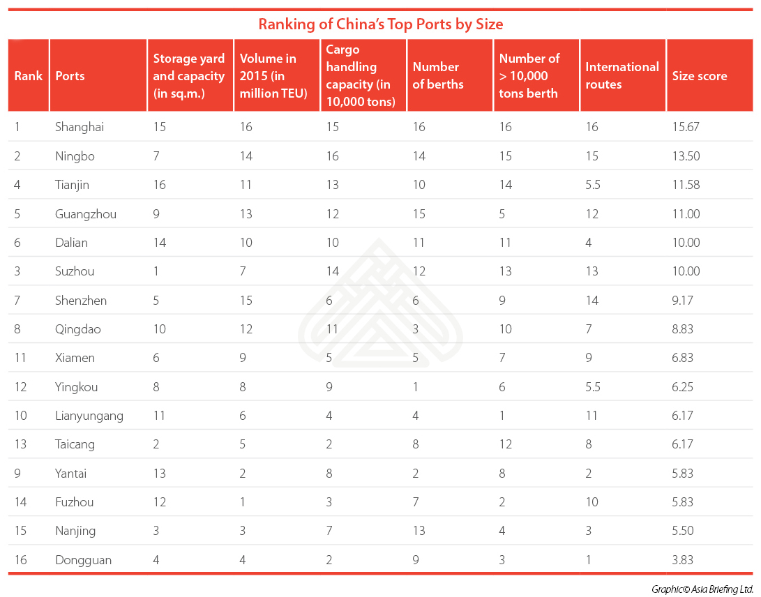 Size indicators reflect the natural advantages of the port itself. The top five ports for size are Shanghai, Ningbo, Tianjin, Guangzhou, and Dalian.