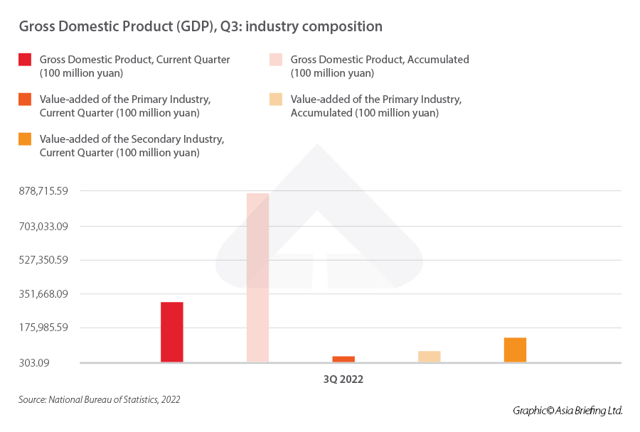 Compared to the previous year, in the third quarter of 2022 – all three sectors of the economy experienced growth: – The value added of the tertiary industry was RMB 46,530.0 billion, up by 2.3 percent.