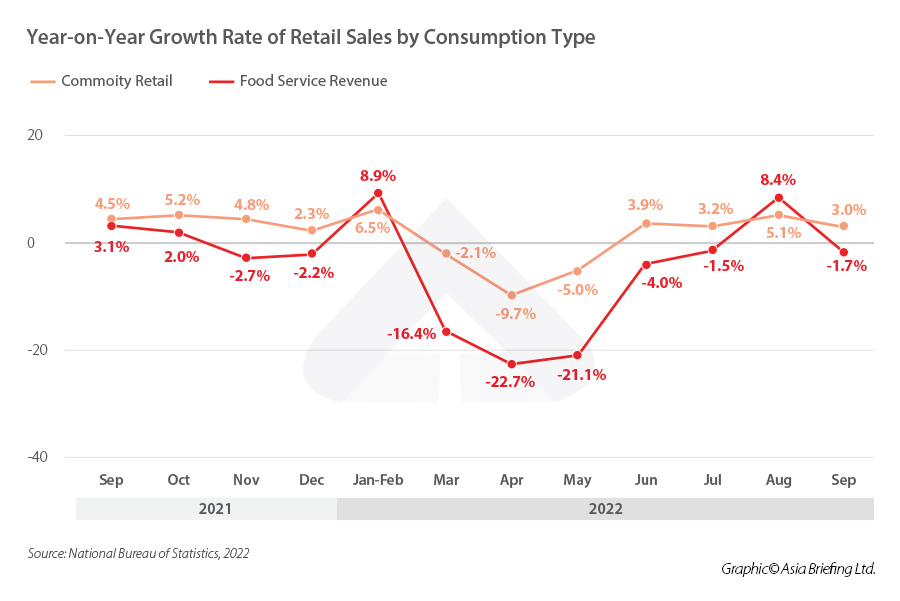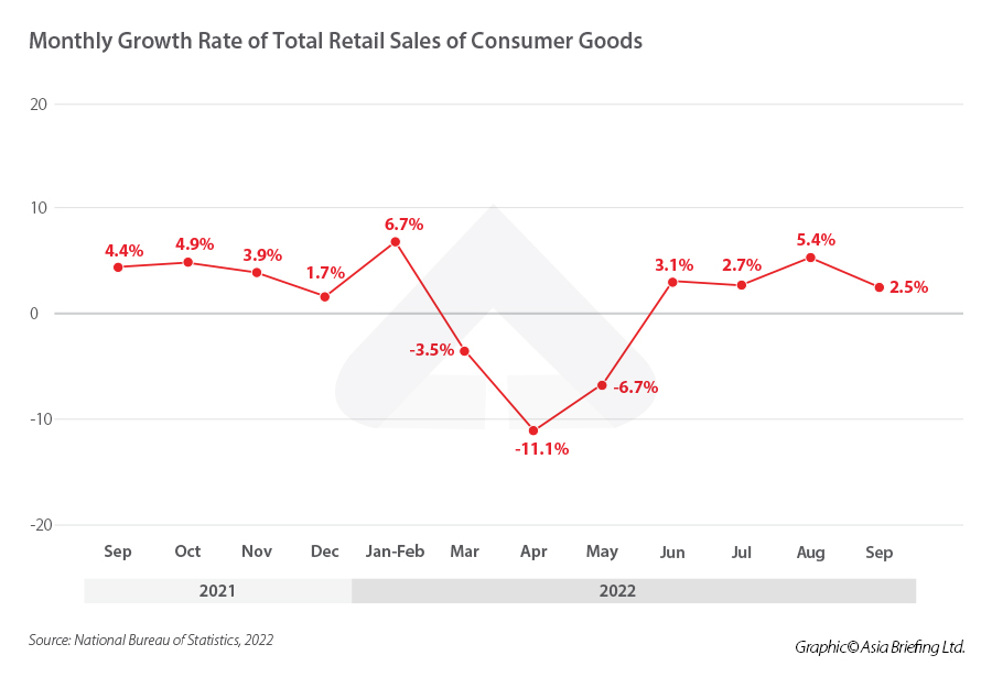 Year-on-year growth in retail sales made a shaky comeback in the third quarter, declining slightly to 2.7 percent in July before increasing to 5.4 percent in August and declining once more to 2.5 percent in September. However, analyses suggest that the trend was partially a reflection of the fluctuation in numbers between June and September, influenced by the macroeconomic conditions and the resurgence of COVID-19 cases. Overall, throughout the first three quarters of 2022, retail sales grew by just 0.7 percent year-on-year.