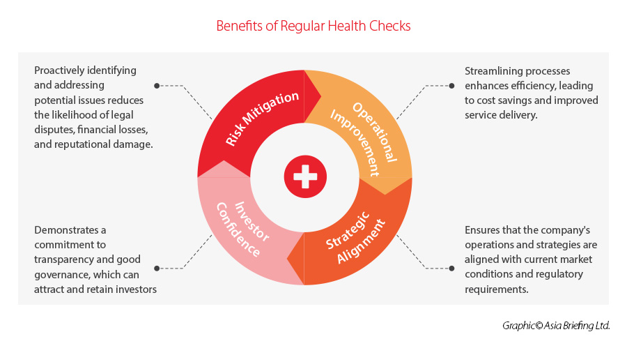 Under such circumstances, health checks are a crucial tool for the continued success of foreign-invested companies in China. Performing routine health checks can help businesses identify hidden tax, legal, or other operational risks, compliance issues, and inefficiencies. If left unattended, these issues can lead to significant penalties and increased costs.