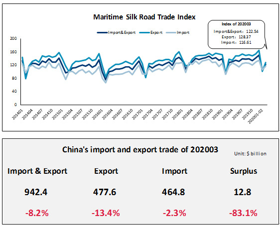 Em março de 2020, o Índice de Comércio Marítimo da Rota da Seda mostrou que o comércio geral de importação e exportação da China para o mês de março caiu 3,92% comparado com ano passado. O comércio de exportação caiu 6,81% em relação ao mesmo período ano anterior; e o comércio de importação recuou 0,47% na comparação anual.