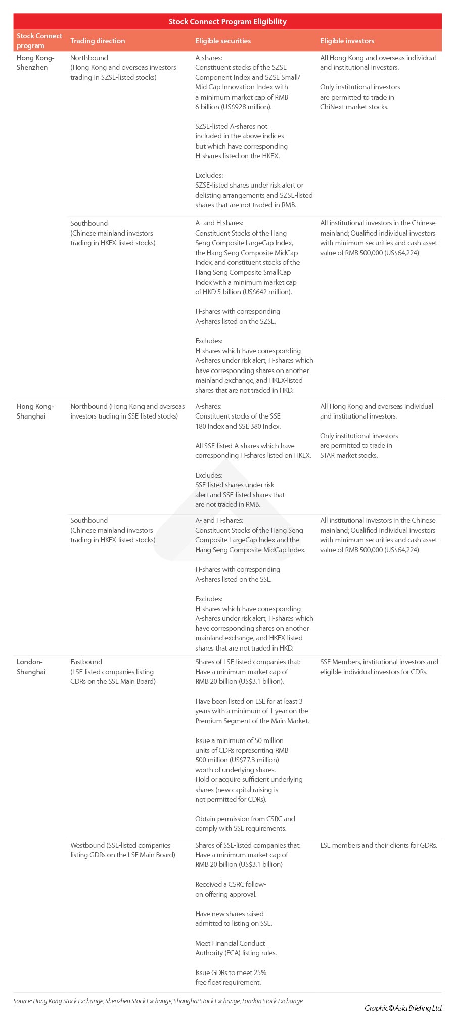 Below are the eligibility criteria for securities and investors to take part in the three Stock Connect programs.
