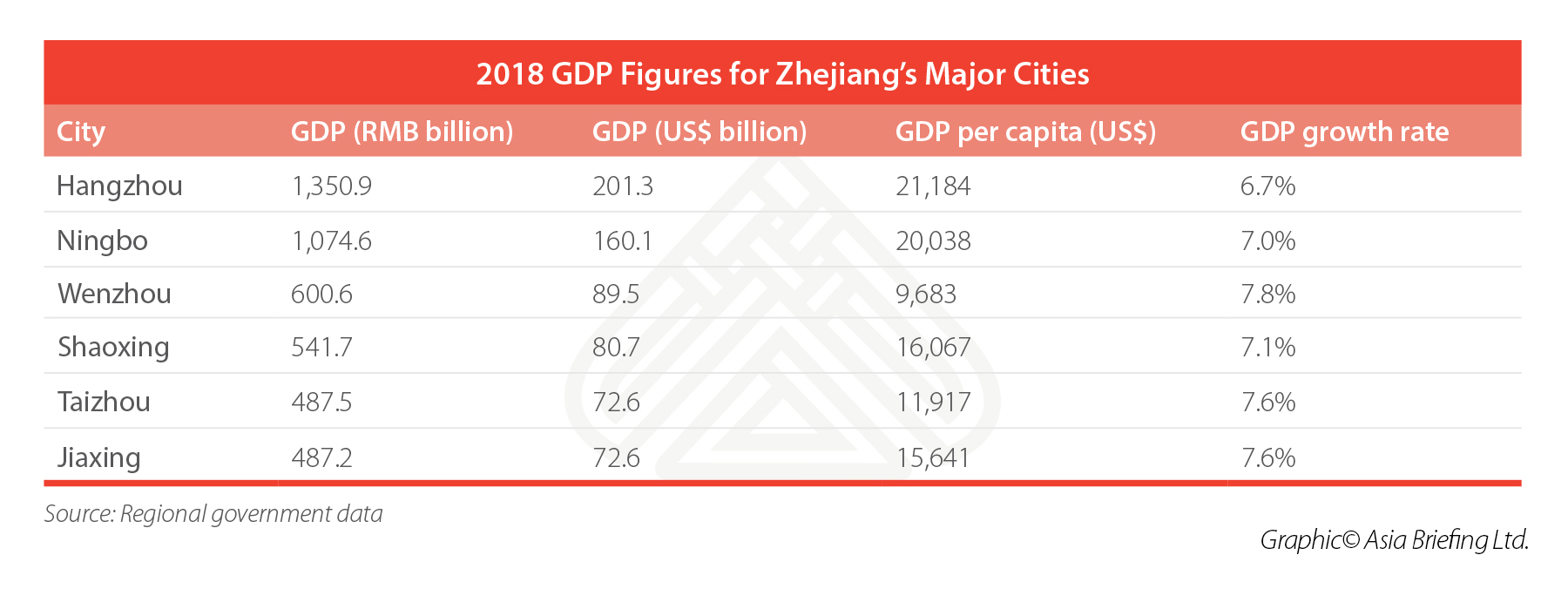 The GDP figures for the major cities in Zhejiang can be seen in the table below.