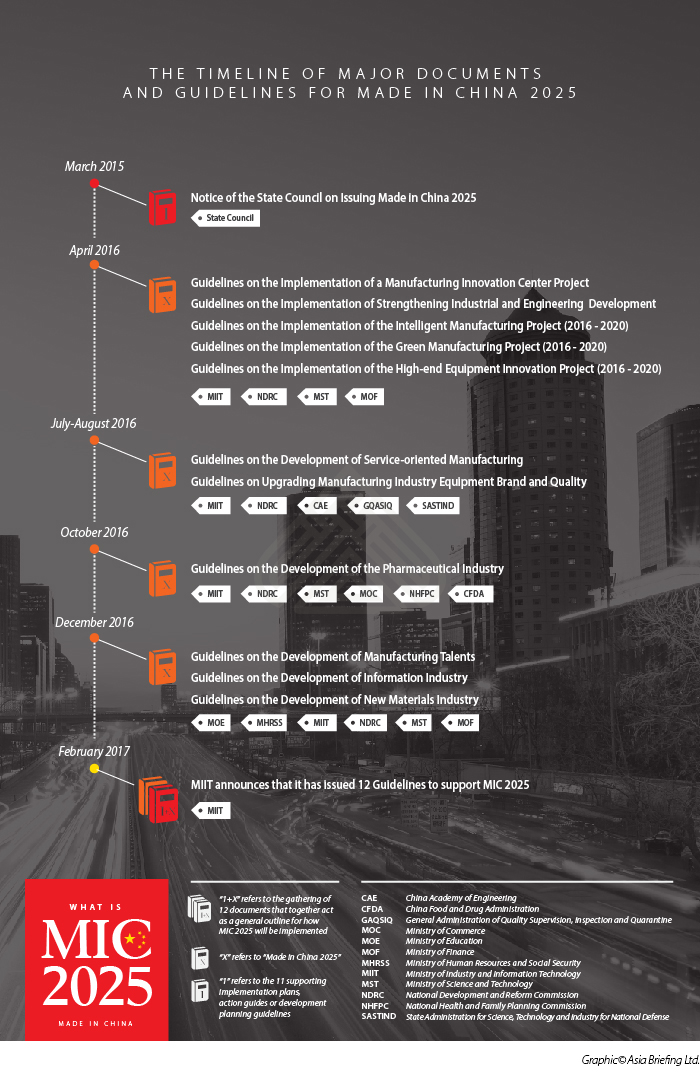 From mid-2016 until the beginning of 2017, the government released 11 implementation guidelines meant to provide roadmaps for different sectors of MIC 2025 (such as innovation center, infrastructure, pharmaceuticals, and more).