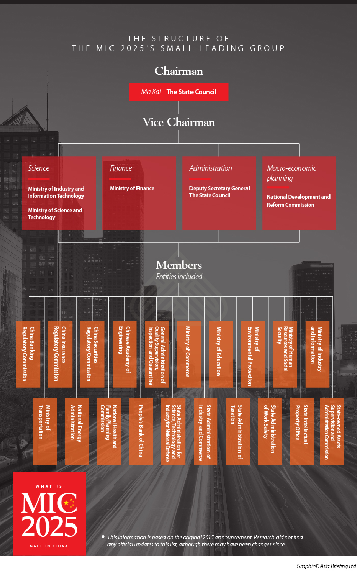 While many aspects of MIC 2025 are a work in progress, the government has released two important sets of information since 2015: the leadership and membership of MIC 2025’s Small Leading Group (SLG) and 12 documents called “1+X” that serve as a general outline for how MIC 2025 will be implemented.