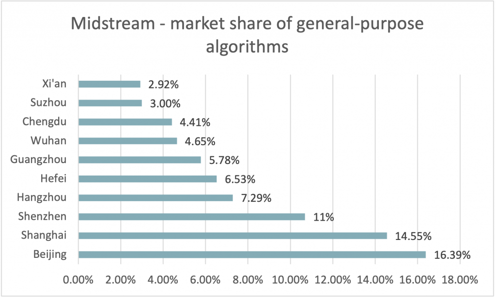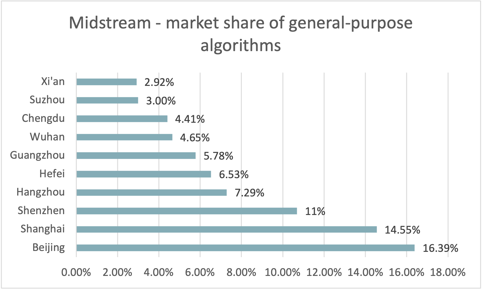 Beijing and Shanghai significantly outperformed other cities in general algorithms. In 2023, Beijing led this sector with a market share of 19.29 percent, followed by Shanghai’s share of 14.55 percent. Shenzhen ranked third in this sector, with a share of 10.69 percent. By the end of 2023, 41.11 percent of financing projects centered on deep learning algorithms were based in Beijing. Beyond these three primary hubs, Hangzhou and Hefei are emerging as significant growth centers.
