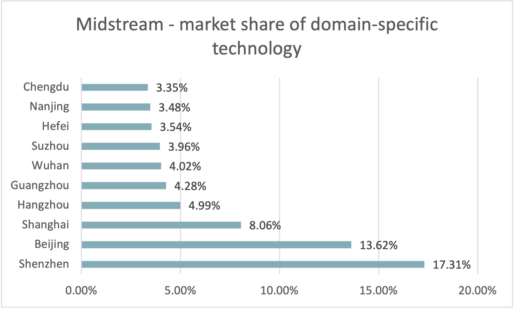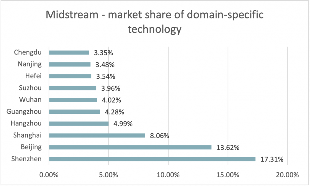 Regarding domain-specific technologies, Shenzhen has recently secured the top position in this sector by nurturing a series of unicorn companies, such as IHS Intelligent Haptronic Solutions, Evolution Dynamics, and Deep Future. Additionally, Hefei’s “China Voice Valley” is at the forefront of the nation’s advancements in Natural Language Processing (NLP) and speech processing technologies. Shanghai’s “Zhangjiang AI Island” is also a notable industrial cluster in this segment.