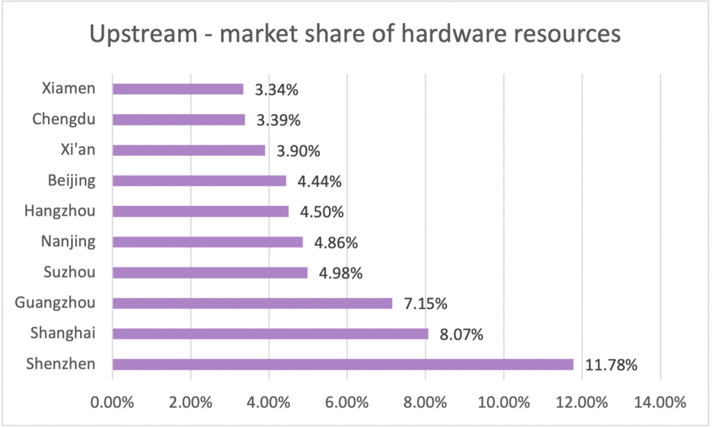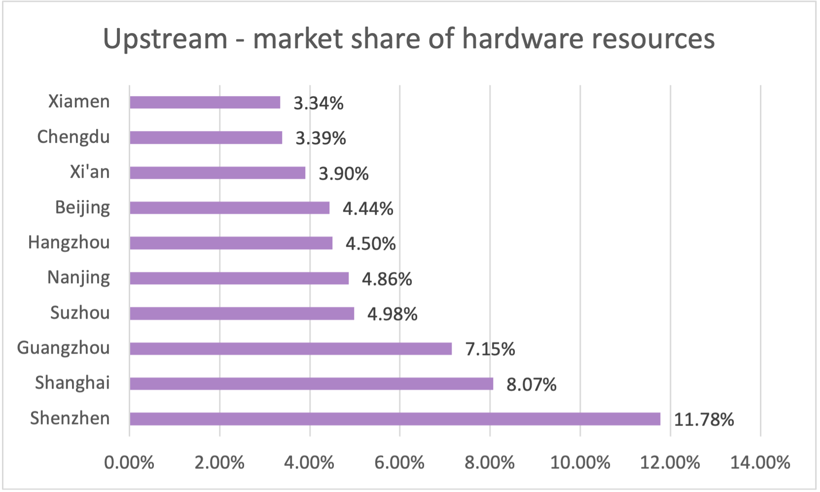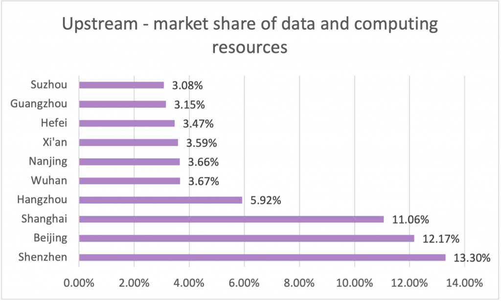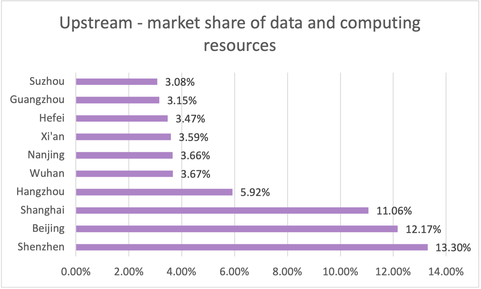 In 2023, Shenzhen led the upstream market in both data and computation resources and hardware infrastructure, accounting for 13.33 percent and 11.78 percent of the national total, respectively. Beijing and Shanghai ranked second and third in data and computation resources, with 12.17 percent and 11.06 percent of the national total, respectively. Shanghai also ranked second in hardware infrastructure, accounting for 8.07 percent of the national total.