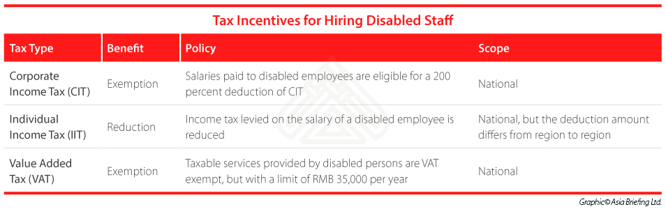 The way in which the CIT exemption for disabled employees functions is noteworthy. In China, companies can deduct a non-disabled employee’s annual salary from the profits that they pay CIT on. For disabled employees, this amount is doubled. If a disabled employee’s annual salary is RMB 100,000, for instance, then the company will be able to deduct RMB 200,000 from the amount that it pays CIT on.