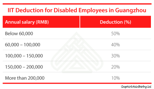 While disabled persons employed anywhere in China are eligible for IIT deduction, China’s tax authorities have yet to implement a nationwide standard. The deduction amount therefore varies from region to region, with the country’s more affluent areas tending to provide greater deductions. Below, we provide an example in Guangzhou, Guangdong province.