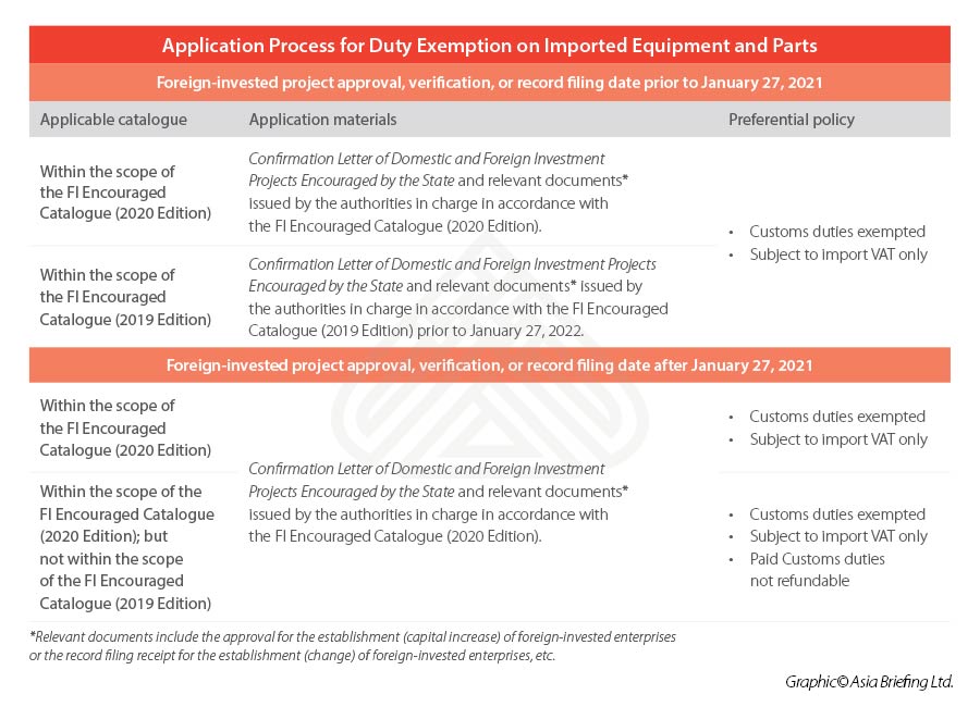 The GAC Announcement [2021] No.9 has clarified that although the duty exemption policy took effect from January 27, 2021, foreign-invested projects approved, verified, or record filed before January 27 are still eligible for application.