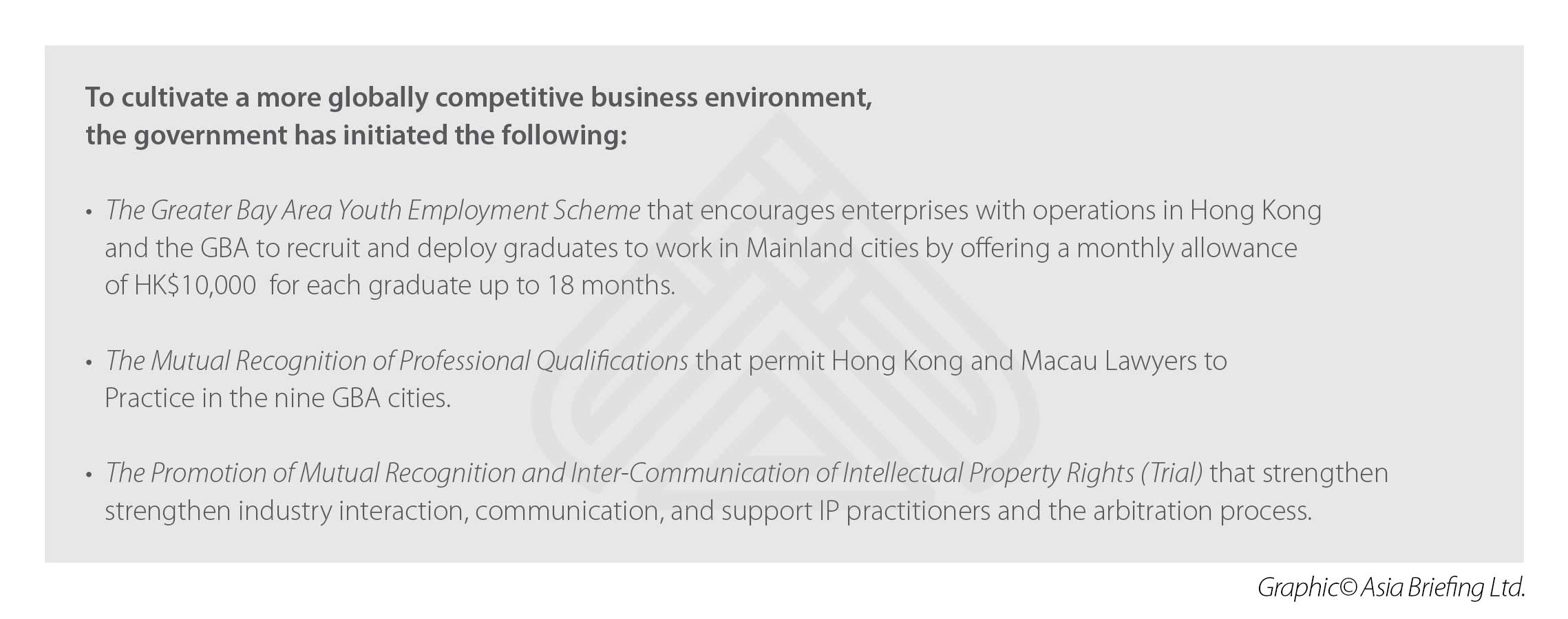 The GBA Outline Development Plan emphasizes the need to continue to build a first-class business environment which is stable, fair, transparent, and predictable. The challenge is not only to encourage advancements to the business environment, but also to coordinate these efforts between three different legal systems, economic structures, and currencies.